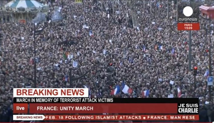 A Párizsi République téren gyülekezett vasárnap délután több százezer ember, hogy a terrorizmus ellen tüntessen. A becslések szerint a megmozduláson több, mint egymillió ember vesz részt.