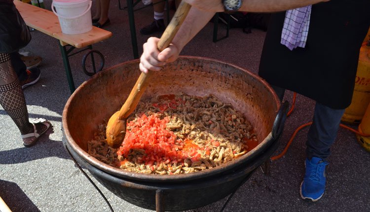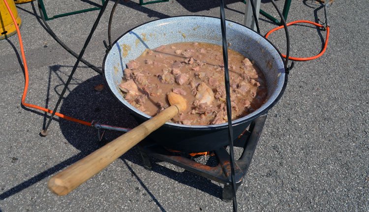 A szürkemarha belül nem szürke. Ez az ökörsütés kevésbé gusztusos része annak, aki nem számít rá, hogy a szerencsétlen marha hiába sül órákon át, belül bizony nyers marad. Ezeket a részeket a középen látható hatalmas serpenyőben sütik meg, miközben a közönség nyálelválasztása órák óta beindult, és éhesen pirul a tűző napon. De talán nem maradt éhesen, egy ekkora állatból nagyjából 500 adag étel jön ki.