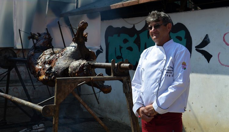 Iglódi Ferenc túl van már több mint ezerötszáz ökörsütésen. Ez a szürkemarha Szomor Dezső ökofarmjáról származik, aki őshonos háziállatok tenyésztésével foglalkozik Apaj környékén, a Kiskunsági Nemzeti Park területén. Az ökörsütés nem szombaton kezdődött, az élőben 470 kilós állat húsát már kedden bepácolták.