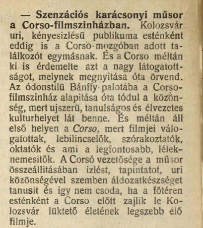 A korabeli sajtó elismerően írt a filmszínházról, mely megnyitása után a kincses város egyik legfelkapottabb kulturális színtere lett. Lebontásának ugyanakkor sokan örültek, mert a Bánffy-palota sokat vesztett szépségéből és értékéből a mozi betonhodálya miatt.