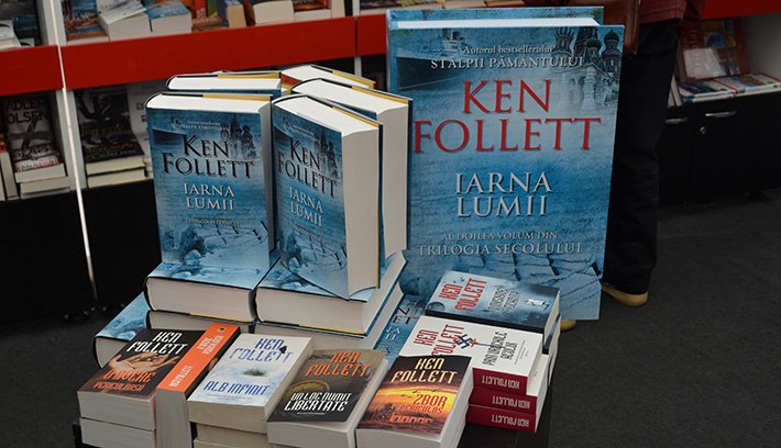 Ken Follett valószínűleg álmában is vastag könyveket ír. Külön emelvények állnak a regényei.