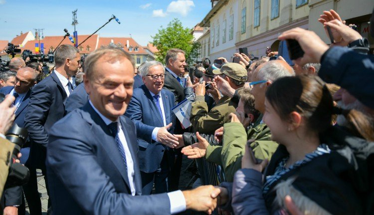 Övék itt a tér: Donald Tusk, az Európai Tanács elnöke és Jean-Claude Junker, az EB első embere Nagyszebenben.