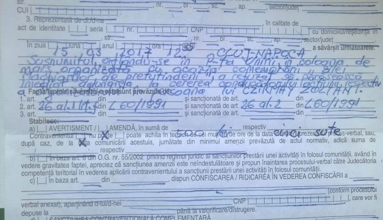 A kézhez kapott jegyzőkönyv szerint az EMNP Kolozs megyei elnökét azért bírságolták meg március 15-én, mert ellenszegült a szervezők felkérésének, és nem hagyta el az ünneplő menetet.