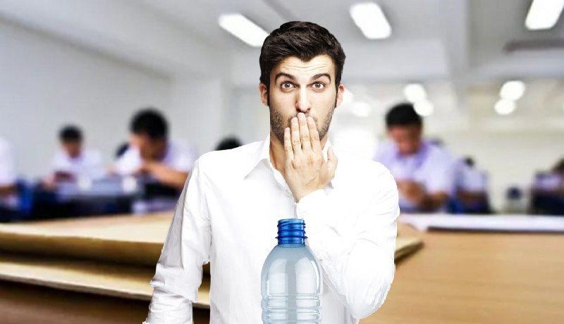 és jelentkezett is azonnal, hogy kimenne az illemhelyre, amennyiben lehetséges, mert az ügy mindennél sürgősebbé kezd válni. Igen ám, csak a ráncos homlokú vizsgabizottság ebbe nem ment bele – a szabályzat szerint ugyanis csak akkor lehet elhagyni a termet, ha a vizsgázó beadja a dolgozatát –, és rideg könyörtelenséggel