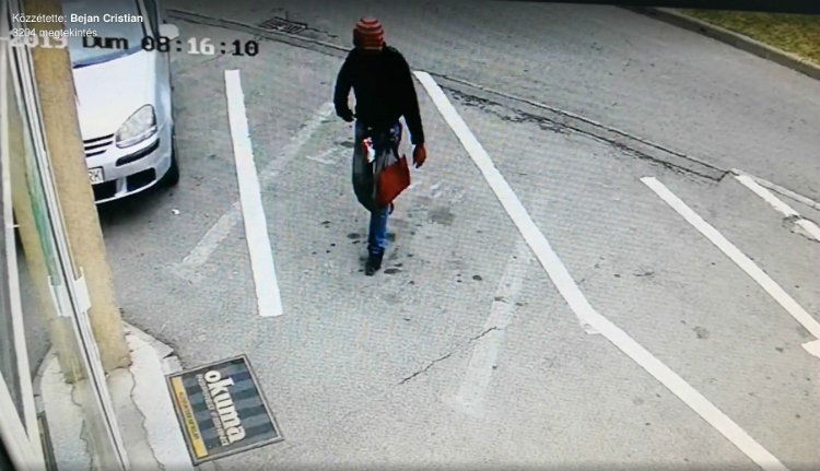Aztán az látszik a videón, hogy besétál e képbe egy férfi. Sötét cipőt, kék farmert, sötét pulcsit, illetve piros-szürke csíkos sapkát visel, övéről vagy az egyik övtartó gyűrűről barna bőrtáska fityeg.
