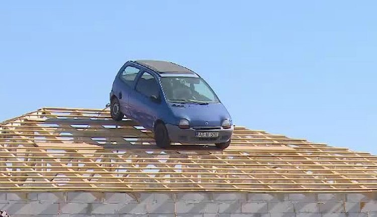 Nosza, építési vállalkozónknak se kellett több: beült egy egytonnás gépkocsiba és felhajtott vele a tetőre. Az autó immár három napja parkol a háztetőn, amely meg se rezdül. Ellenvetés pedig nincs az ügyfelek részéről. Nem is igen lehet.
