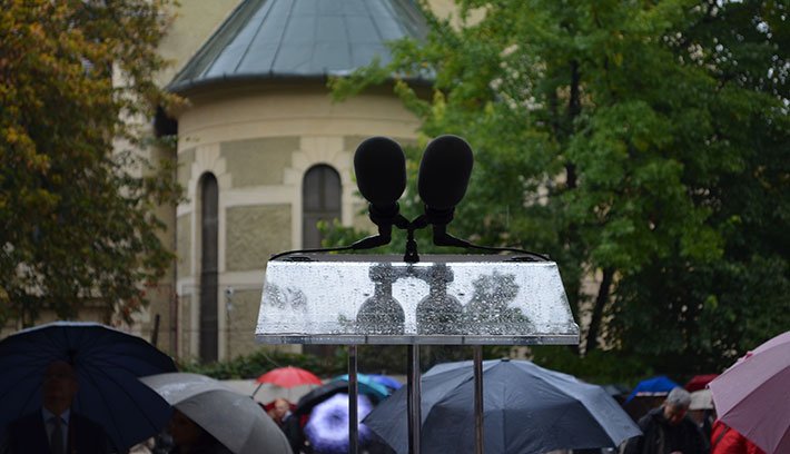 Ez a szónoki emelvény, az avatási ceremónia alfája és omegája, itt mond nemsokára beszédet Orbán Viktor. Átázik a papírja, ha nem törlik le a plexilapot.