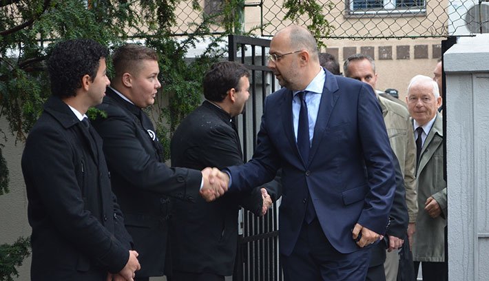 A miniszterelnököt Kató Béla, az Erdélyi Református Egyházkerület püspöke fogadja és vezeti be az udvarra.