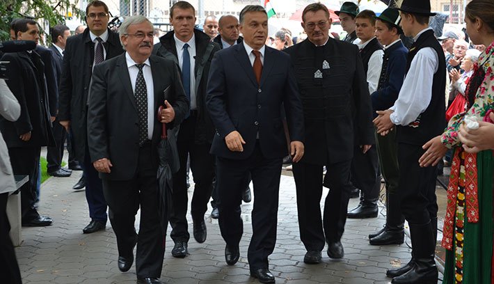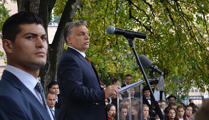 Orbán köszönti a nyakkendős első sort, ruhásszekrény méretű testőreinek szigorú pillantásai közepette.