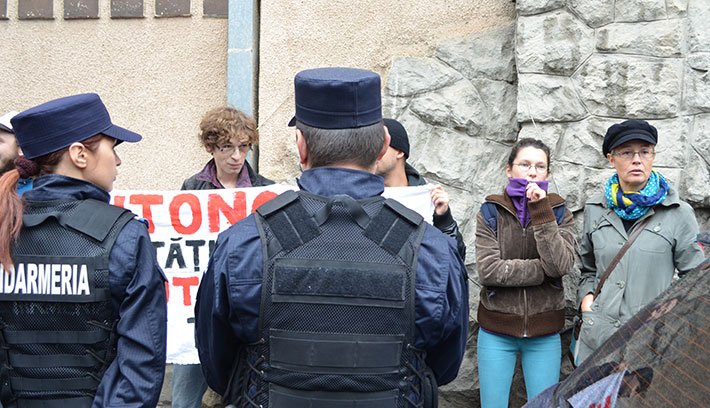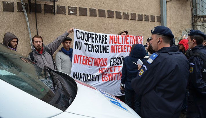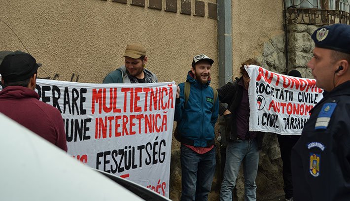 Interetnikus feszültség helyett multikulti együttműködés, valamint Autonómiát a civil társadalomnak – ez olvasható románul és magyarul a két transzparensen. Skandálás nincs, nem zavarnak, őket sem zavarja senki. A beígért ellentüntetésből nem lett semmi.