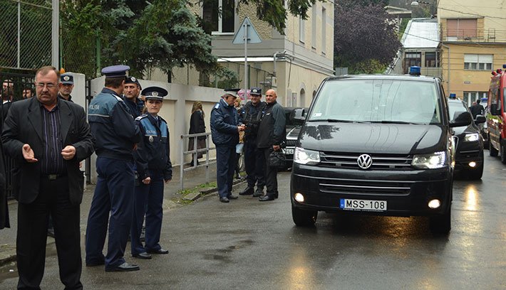 Orbán Volkswagen Transportere járó motorral várakozik a miniszterelnökre. A helyszínen rengeteg egyenruhás és civil rendőr vigyáz, hogy Orbán nehogy Erdélyt a hóna alá csapva hirtelen távozzon.
