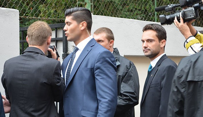 A miniszterelnök emberei. Nem, ő nem fotómodell, pedig az is lehetne. Ő egy két méter magas vállas testőr, szemének villanásai nem sok jót ígérnek.