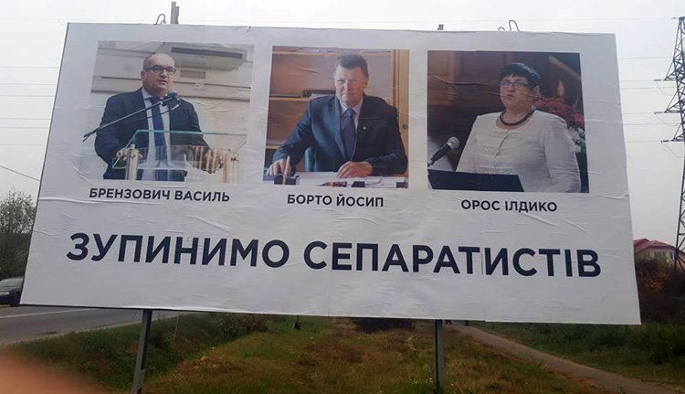 A fehér alapú, ukrán nyelvű óriásplakátokon Brenzovics László, a Kárpátaljai Magyar Kulturális Szövetség (KMKSZ) elnöke, az ukrán parlament képviselője, Barta József, a KMKSZ alelnöke, a Kárpátalja megyei tanács (közgyűlés) első elnökhelyettese és Orosz Ildikó, a Kárpátaljai Magyar Pedagógusszövetség (KMPSZ) elnöke, a II. Rákóczi Ferenc Kárpátaljai Magyar Főiskola rektora, megyei tanácsi képviselő fotói láthatók a nevükkel együtt.