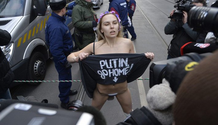 FEMEN-aktivista tiltakozik Putyin látogatása ellen az Országháznál