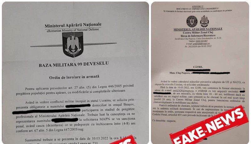A védelmi tárca felhívta a figyelmet, hogy valakik újabb hamis dokumentumokat terjesztenek Kolozsváron és Brassóban. Valószínűleg a lakosság megijesztése, a bizonytalanság növelése a terjesztők célja, olyan spekulációk, értelmezések révén, melyek köszönőviszonyban sem állnak a valósággal – fejtette ki a védelmi minisztérium.