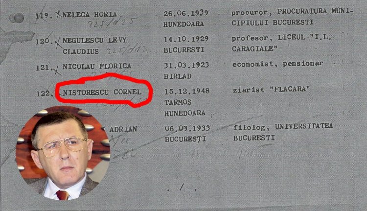 2. Cornel Nistorescu (122. sz.), a román sajtó egyik közismert figurája. 1989 előtt a Viața Studențească, a Scânteia tineretului és a Flacăra lapok szerkesztője volt, a forradalom után pedig az Evenimentul zilei (1997–2005) és a Cotidianul (jelenleg is) lapok vezetője.