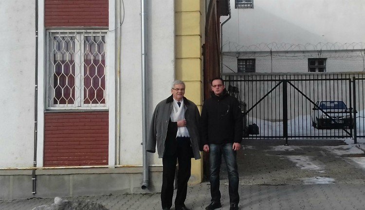 Tőkés László és Tőke Ervin, az EMNP helyi elnöke a csíkszeredai börtön bejáratánál.