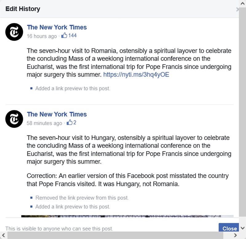 A legfrissebb baklövést a tekintélyes, gyakran idézett és hivatkozott The New York Times című amerikai napilap követte el azzal, hogy Facebook-oldalára vasárnap kitette: Ferenc pápa hét órás látogatást tett Romániában, ahol misét celebrált a Nemzetközi eucharisztikus kongresszuson – vette észre a mandiner.hu.