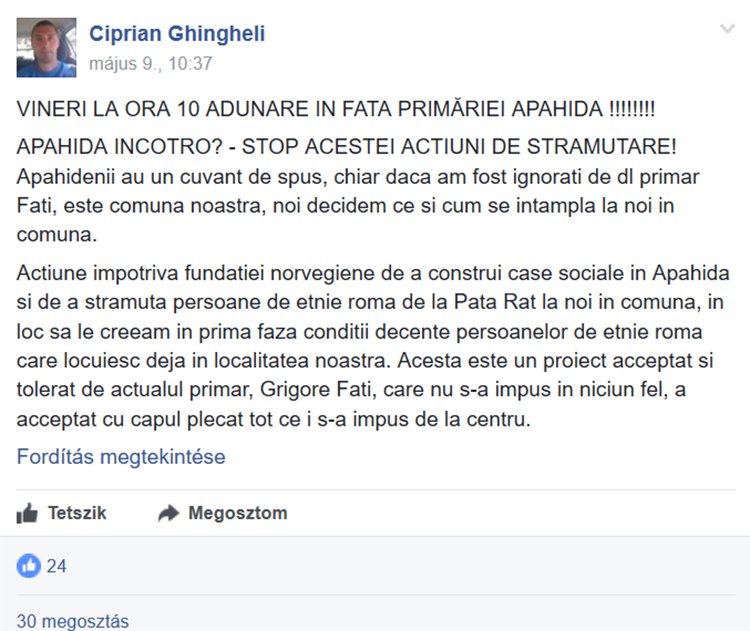 Az interneten is terjedő felhívás szerint a község vezetése Grigore Fati polgármesterrel az élen elmulasztott konzultálni az apahidaiakkal arról, hogy több roma családot a településre költöztetnének szociális lakásokba.