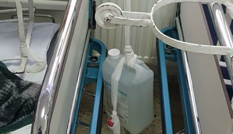 A kórház ortopédiai osztályán készült felvétel tanúsága szerint nem estek kétségbe attól, hogy nem állt rendelkezésre kellő mennyiségű ellensúly egy törött lábú beteg lábának kimerevítéséhez: az egészet megoldották egy vízzel megtöltött műanyag kannával, amelyet aztán valamilyen fehér színű szövettel rögzítettek a sérült végtaghoz.