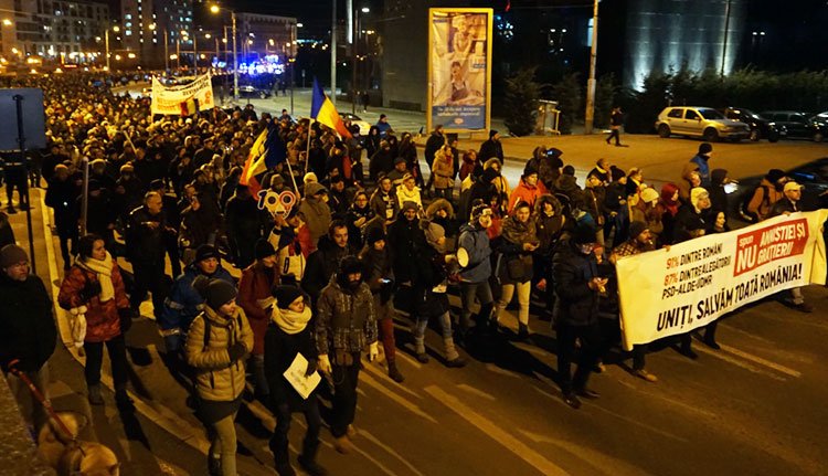 Bukarestben néhány ezren tüntettek a kormánypalota előtt, ahol az igazságügyi törvényeket módosító kormányrendeletet szidták, de kijutott a nem túl baráti hangvételű megemlékezésekből Liviu Dragneának, a kormány fő erejét adó Szociáldemokrata Párt (PSD) elnökének is.