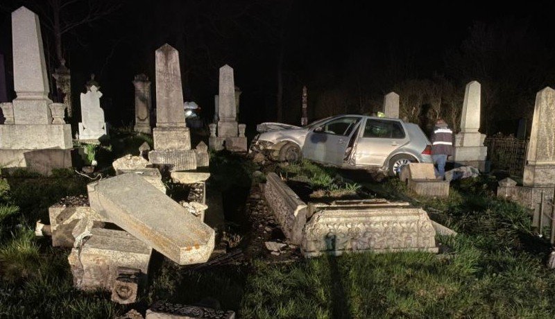 Hősünk nyomhatta rendesen a gázpedált, aztán a jármű lesodródott az úttestről, majd a kerítést letudva a síremlékek közt kötött ki, meg is rongált néhányat.