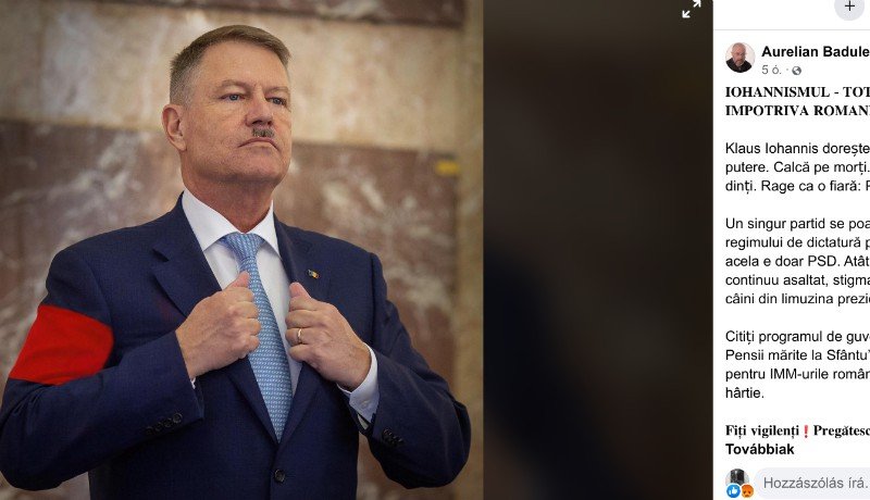 Úgy látszik, ahogy Iohannis nem unja a rendszeres peszedézést, úgy a riválisai is imádnak olykor hitlerezni egy jót a közösségi médiában. A legújabb ilyen bejegyzést Aurelian Bădulescu, Bukarest volt PSD-s alpolgármestere hozta össze pénteken, az illusztráción pedig a diktátorra jellemző bajszot és náci karszalagot is biggyesztett Iohannisra.