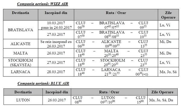 Máriustól több új nemzetközi repülőjárat rendszeresítését jelentette be az Avram Iancuról elnevezett kolozsvári repülőtér vezetősége. Márciustól 10-én indul az első, melynek úti célja Szlovákia fővárosa, Pozsony. Március 26-tól a Alicante (Spanyolország) és Málta, március 27-én Stockholm (Svédország), március 28-tól pedig Lárnaka (Ciprus) válik könyebben megközelíthetővé Kolozsvárról. A felsorolt járatok a WizzAir légitársasághoz tartoznak.