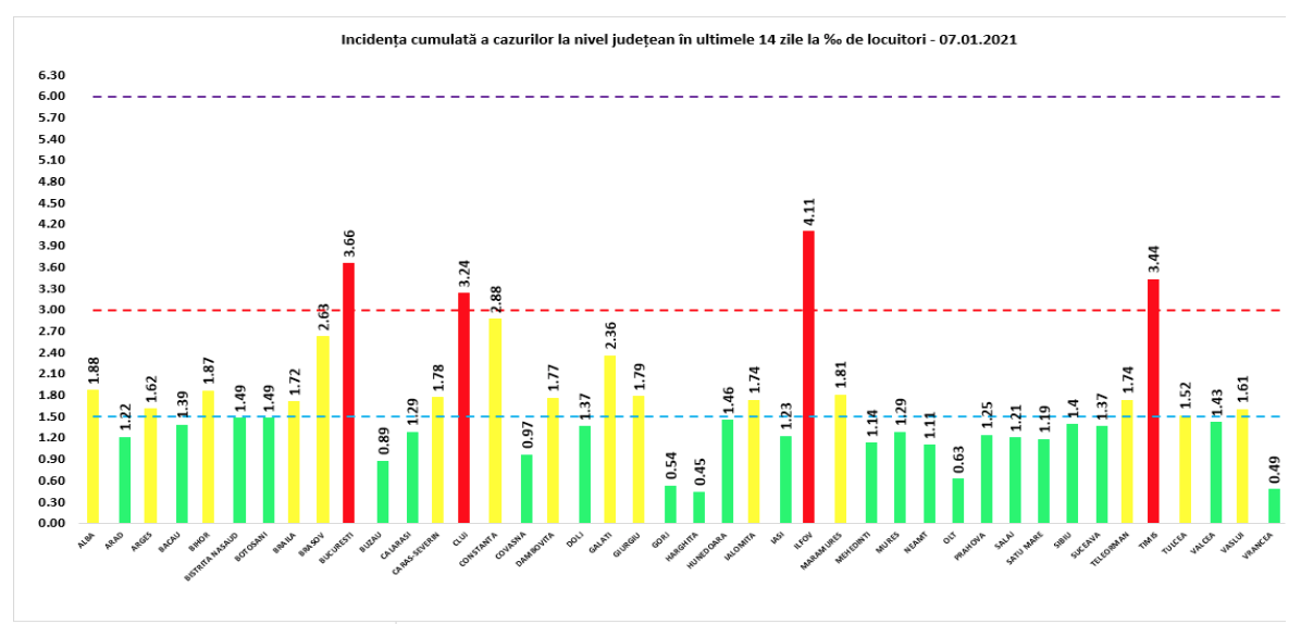 A lakosságarányos fertőzési ráta a főváros után Ilfov, Kolozs és Temes megyében haladja meg a 3 ezreléket.