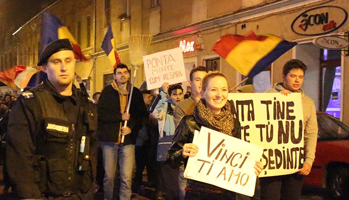 Le a kommunizmussal! Le Pontával! Ponta, ne feledd, az ország nem a tied! PSD=PCR! – skandálta a tömeg, mely kiállt a szavazáson való részvételben akadályozott külföldön élő román állampolgárok mellett is.