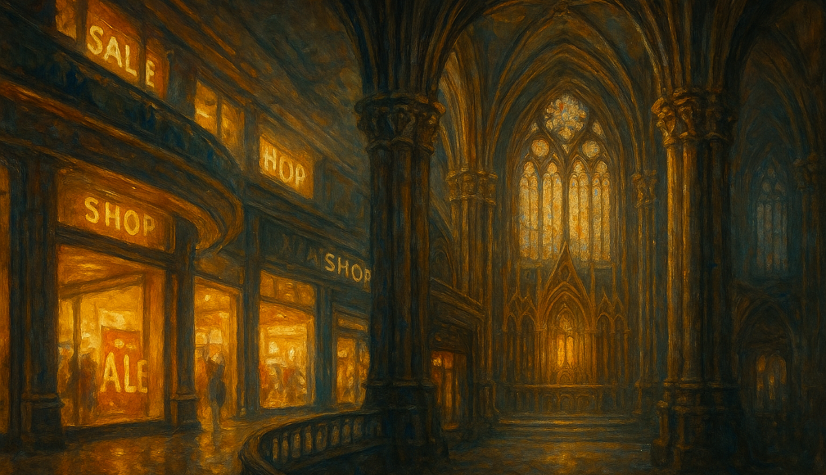 Akárcsak egykor a katedrálisok, a plázák is megváltást ígérnek. Ahol sokszor céltalanul, de ünnepélyesen elsétálunk a fényes kirakatok előtt, vallásos áhítattal tisztelve a logókat és márkákat, majd a próbafülkébe lépve levetjük a régi ruháinkat, és az újakat magunkra öltve, tükörbe nézve, megtisztulva léphetünk ki onnan. A katedrálisok eszkatologikus, túlvilági megváltást festettek fel, a plázák azonnali, folyamatos megváltást ígérnek, csak be kell lépni a földi örökkévalóság kapuján.