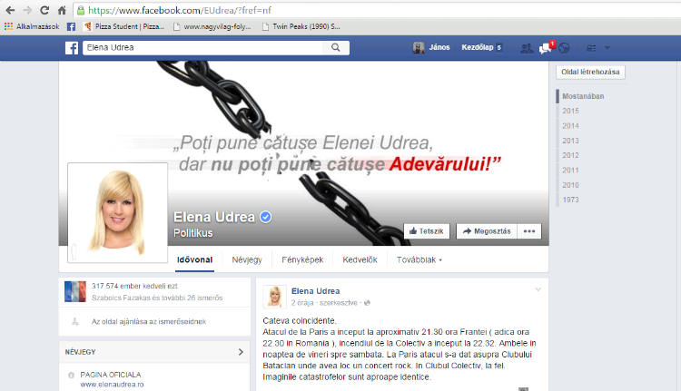 És akkor szembejön a Facebookon Elena Udrea, és ezt írja, szó szerint: