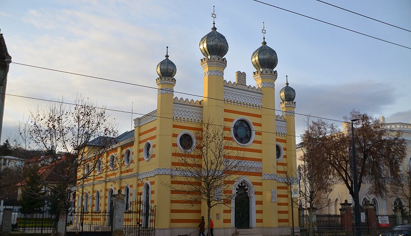 Már nem sok épület maradt a listámon. Kicsit lejjebb a Nagy (Ferencz József, Horthy Miklós, Horea) úton ott áll a város egyetlen működő zsinagógája, a csinosan-színesen felújított neológ zsinagóga. Fotózás közben eltöprengtem azon, miért is keleti, mór stílusú ez az épület, ha egyszer nem iszlám a vallás, ami hozzá társul. Nem tudtam eredményre jutni, ezért felhívtam Guttmann Szabolcs építész urat és megkérdeztem tőle. Azon túl, hogy igen, hát ilyenek voltak a tervek, mondta, gondolni kell arra is, hogy a világ minden táján élő zsidó közösségek olyan formákra (is) gondoltak, amikor megrendeltek egy-egy zsinagógát, amelyek arra a helyre emlékeztetik a betérőt, ahol a zsidó nép élt. Hát ezért (is) olyan ez a zsinagóga, amilyen.
