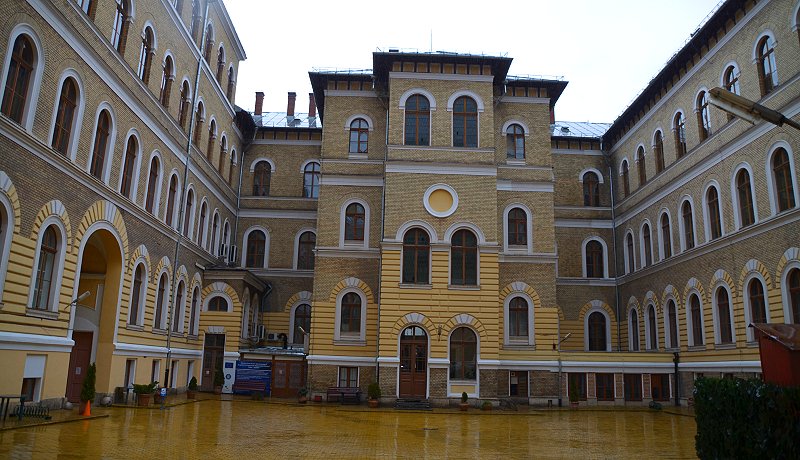 Innen észak fele mentem tovább, jó, kicsit nyugatnak is, a Szent György tér (ma Lucian Blaga) felé, ahol a komcsi diákművelődési házzal srégen szembe az egyetemi könyvtár (naná, hogy klinkertéglás) épülete szökken a magasba. A főbejárat itt is zárva volt (nem tudom, miért), papírra vetett nyíl mutatta, merre menjen az, aki beljebb akar kerülni. Az épületbe nem mentem be, tudtam, hogy itt is kapusok, ügyfélrendészek, bürokraták hada várja a szerencsétlen engedélykérőket. Bejártam viszont az első ránézésre labirintikusnak tűnő, alagutakkal összekötött belső udvarrendszert. Gondolom, annak idején itt olvasgatni lehetett, jó idő esetén. Itt-ott vannak még padok. De inkább raktárnak tűnik a tér, nem valami vidám látvány. Viszont ha felfele néz az ember, na, az lenyűgöző. (Homlokzati fotó helyett ezért választottam egy ilyen belső képet.) És naná, hogy egy idő után rám vetette magát egy kapus, hogyaszongya, mit keres maga itt!!! Mondom (az ordenáré hangnemen kicsit csodálkozva), nemzetbiztonsági titkokat. Tilos a fotózás!!! Mondom, szeretném látni az erre vonatkozó feliratot, tiltótáblát. Akkor is tilos!!! Mondom, akkor kérem, fogjon le, kötözzön meg, vigyen a vezetőség elé. Na végre, elnevette magát. Jót paroláztunk a végén.