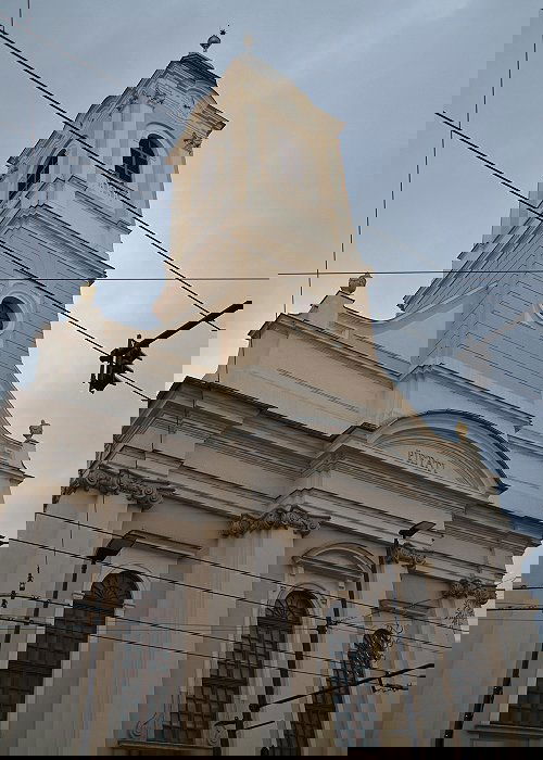A Kossuth Lajos utcán mentem tovább a Főtér fele, ahol a sarkon az evangélikus templom áll. Ezt nyilván nem Reményik Károly röptette a magasba, de a 19. század végi felújítás során a hírek szerint kerek négy méterrel magasították meg a templomtornyot és ez a toronyrakás az ő munkája.