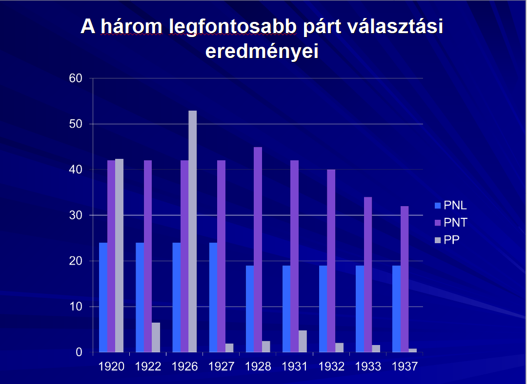 Az egyik legtipikusabb példa a Nemzeti Liberális Párt esete, amely az 1920-as választásokon ellenzéki pártként csupán 6,8 százalékot szerzett, míg 1922-ben már kormánypártként 60,3 százalékot ért el. Majd 1926-ban ismét ellenzékbe szorult, akkor visszaesett 7,3 százalékra, 1927-ben kormányon lévőként 61,7 százalékot szerzett, hogy 1928-ban újra visszaessen 6 százalékra. A két másik nagy román párt, a Nemzeti Parasztpárt és a Néppárt választási eredményei is hasonló mintát követnek.