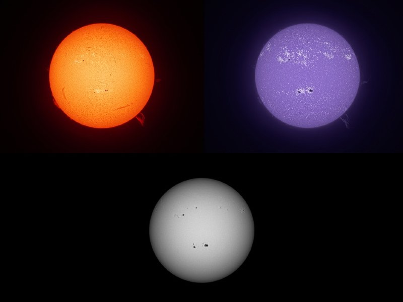 A Nap három arca, ún. keskeny sávú szűrőkkel és a fekete-fehér kamerával rögzített képnek jelentést adó ún. hamis színes kódolással: a hidrogén alfa (a valóságban mélyvörös), a kalcium K (a valóságban ibolya-ultraibolya) és az oxigén III (a valóságban türkiz) sávjában. Utóbbi mutatja azt, a fényerőt csökkentő szűrőn keresztül (például napfogyatkozásos szemüveg) milyennek látja a Napot a szemünk. Igen, fehérnek, és a napfoltokat leszámítva meglehetősen eseménytelennek.