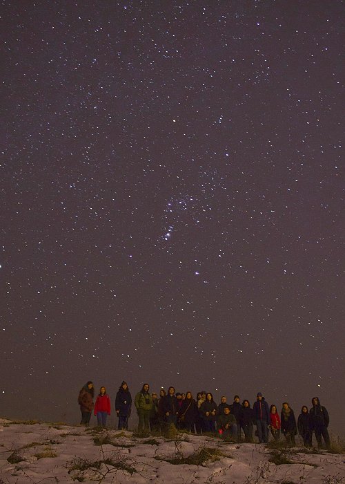 Csillagtúrázókkal 2015 telén. Felettünk az Orion csillagkép és szinte a kép közepén az Orion-köd derengése.