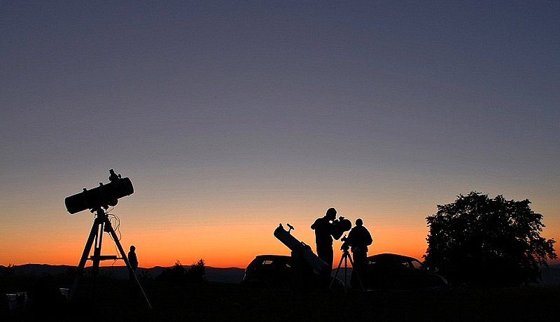 Távcsőállítás az alkonyatban, amatőr csillagászok terepen. Angolosan csillagbuli, magyarul, szerényebben: észlelés.