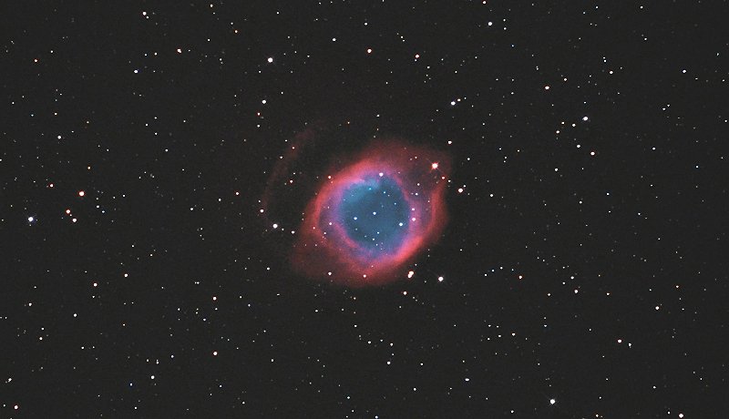A Helix-köd, egy haldokló csillag utolsó pöffentése: a ledobott gázburokban a gerjesztett hidrogén vöröse és az oxigén kékje uralja a színtelen hátteret. A levegő, amit lélegzünk, sok milliárd évvel ezelőttről talán épp egy ilyen csillag ledobott gázburkából származik. Egész éjszakás fotó, a képanyag jellemzője, hogy több óra feldolgozást igényel, mire összeáll a képernyőn a látvány. Ha kevés a fény, az emberi szem, ha lát is valamit, azt szürkés derengésként látja, hiába színes az égitest.