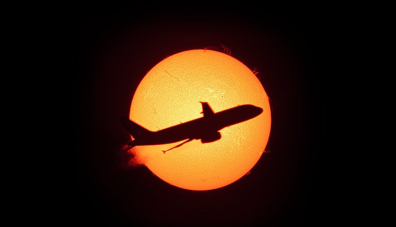 Gépmadár kontárkodik a Nap észlelésébe: a kolozsvári repülőtér miatt előfordulnak ennyire látványos találkozások is, nem csak a magasabban húzó, emiatt jóval kisebbnek tűnő repülőkkel.