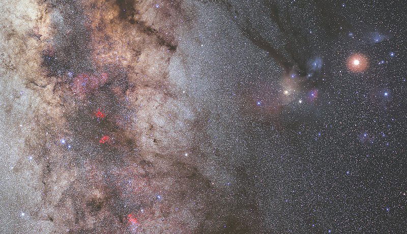 A Tejút magvidéke, bő tenyérnyi területe az égboltnak. A bolygók fényesek, de aprónak látszanak az égen. Ezzel szemben az ún. mélyég-objektumok, csillaghalmazok, ködösségek, galaxisok adott esetben óriásinak látszódnának, csak hát halványak. Hosszú megvilágítású fotózással csalogathatóak elő ezek a részletek. Ez a kép több órányi fényt tartalmaz, részben a megvilágítás, részben a fényképezőgép melegedése okozta szemcsék, a zaj szűrése végett.