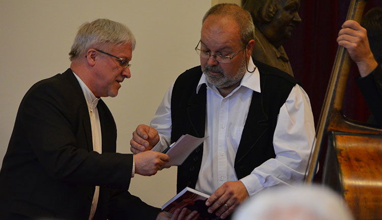 Szép Gyula, a magyar opera igazgatója vezeti a könyvbemutatót. Itt még öltönyben-nyakkendőben, de a gálaestre átöltözik, később elmondjuk, miért.