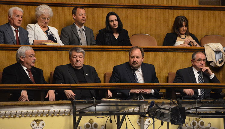 Az opera díszpáholyában az egyházi vezetők ülnek. Református, római katolikus, evangélikus, unitárius testvériség.
