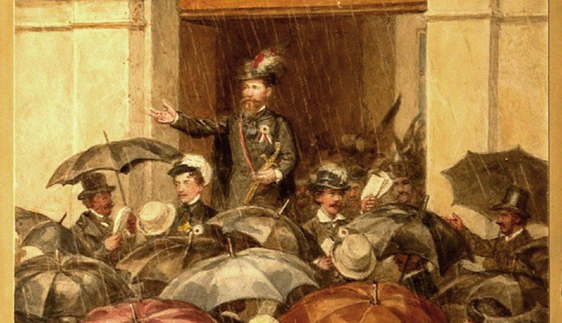 Ezeket a sorokat Barabás Miklós írta fel annak a festménynek az aljára, amely a fiatal Jókai Mórt ábrázolja, amint a Landerer és Heckenast-nyomda előtt beszédet tart az összegyűlt, esernyős tömegnek 1848. március 15-én – jó tudni, hogy akkor is ugyanolyan esős idő volt, mint idén.