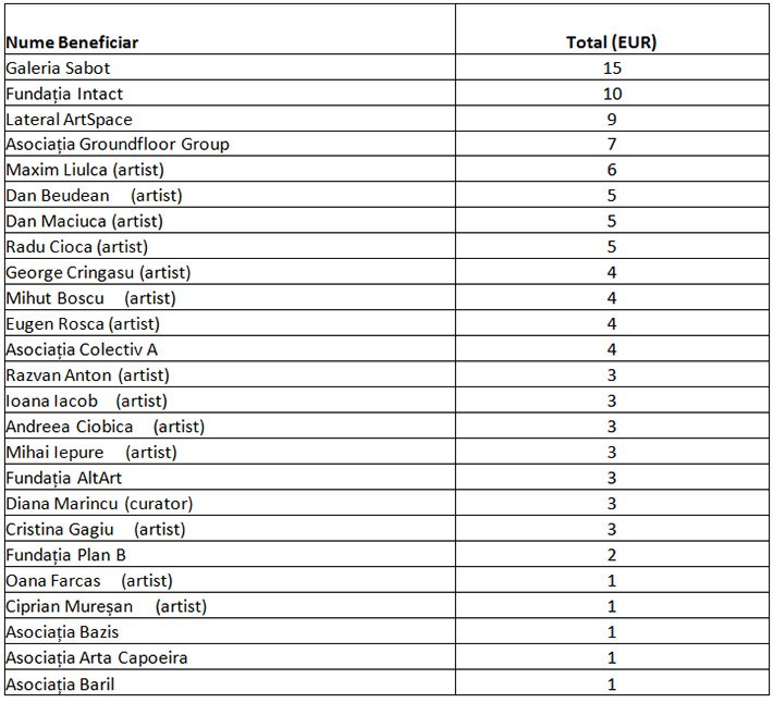 Az Ecsetgyár Föderáció elnöke – állításai szemléltetése céljából – rendelkezésünkre bocsátott egy táblázatot, amely a párizsi Tajan árverésből szerzett pénz elosztását illusztrálja. A táblázat alapján a legtöbb támogatást az a Sabot galéria kapta, amelynek igazgatója, Daria Dumitrescu az új szervezet egyik alapítója. (A nevek melletti számok arányokat fejeznek ki.)
