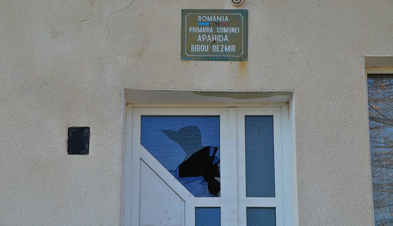 Románia, Apahida község polgármesteri hivatala, dezméri iroda. Talán a háborús felek valamelyike törte be az ablakot. Talán nem.