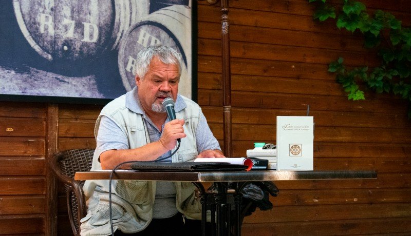 Molnár Vilmos a Bulgakovban, előtte a Kőrösi Csoma Sándor-kötet (fotó: Mărcuțiu-Rácz Dóra)