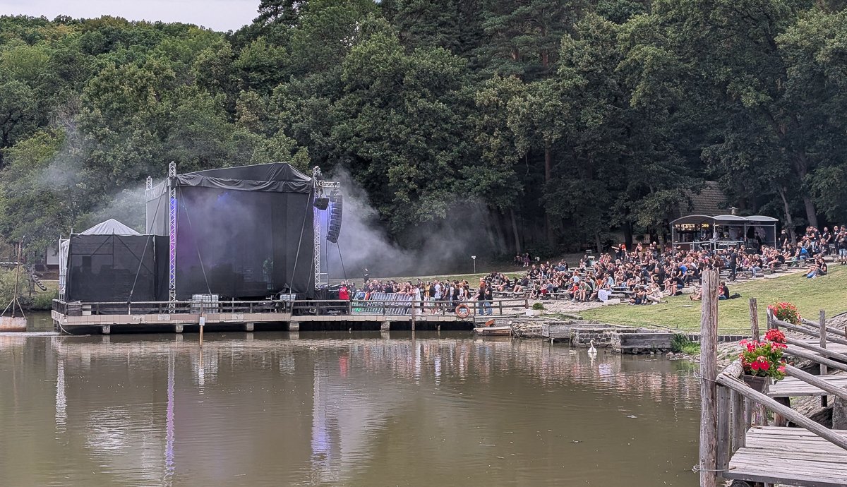 Megpillantjuk a tavat és a szélén a nagyszínpadot: