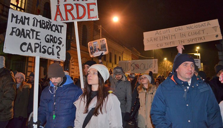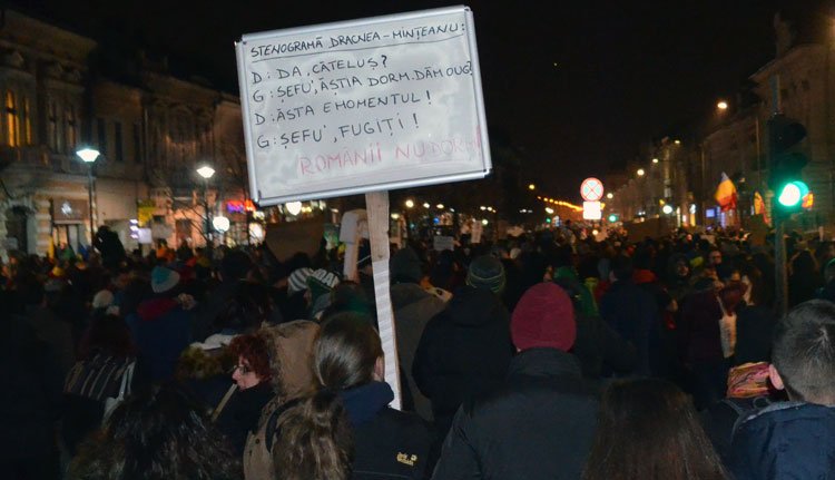 Bár méretei miatt nehezen mozog, ezért lassan halad a tömeg a Mărăști felé, jó hangulat uralkodik a tüntetők között. Az emberek énekléssel, dobolással, ugrálással és ötletes táblákkal szórakoztatják magukat és egymást. A csendőrök szokás szerint békésen kísérik a menetet a Dorobanților utca szélein.
